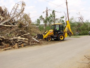 The 3CX’s front end loader is perfect for debris collection, while the reach of its excavator end allows the unit to be used to extend over debris piles. The dealership received the backhoe on May 10, and municipal workers in surrounding communities will use it to continue clearing debris.